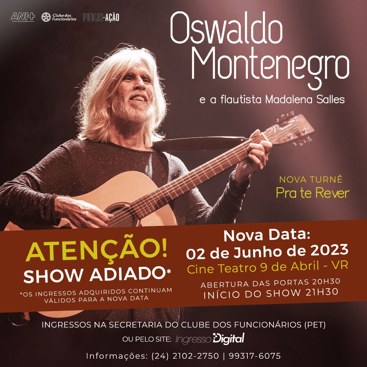 O show musical com Oswaldo Montenegro e a flautista Madalena Salles, que aconteceria amanhã, dia 05 de maio, a partir das 20h30, no Cine Teatro 9 de Abril, em Volta Redonda, foi adiado por motivos de saúde do artista. Oswaldo Montenegro foi diagnosticado com uma severa infecção nas cordas vocais, estando impossibilitado sequer de falar, pelos próximos dias.