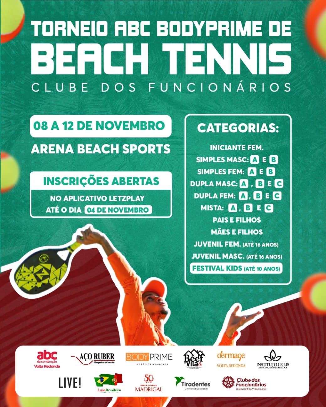 O Clube dos Funcionários se prepara para sediar mais um grande evento esportivo. O Torneio ABC Bodyprime de Beach Tennis acontece entre os dias 8 e 12 de novembro, na Arena Beach Sports, na PET – Praça de Esportes Tabajaras. As inscrições estão abertas até sábado, dia 4 de novembro, e podem ser realizadas através da plataforma LetzPlay: https://letzplay.me/ArenaBS-