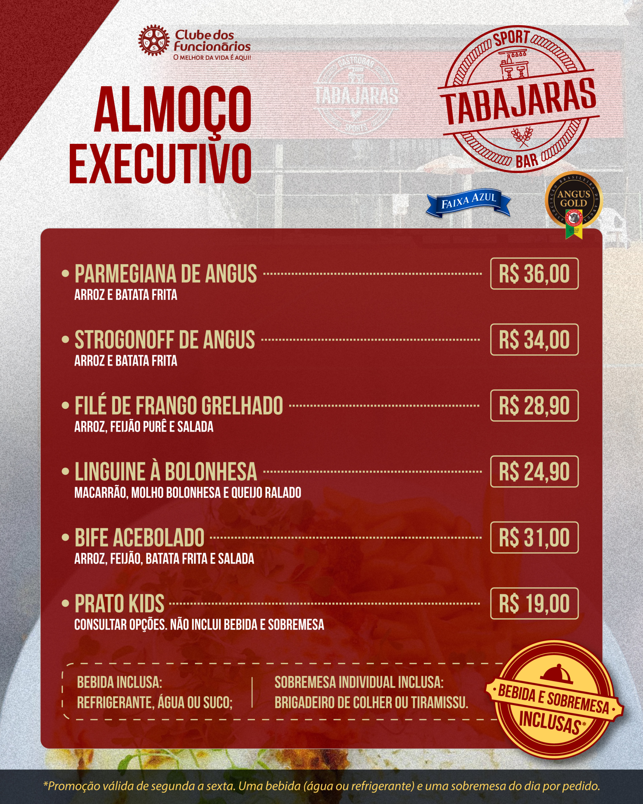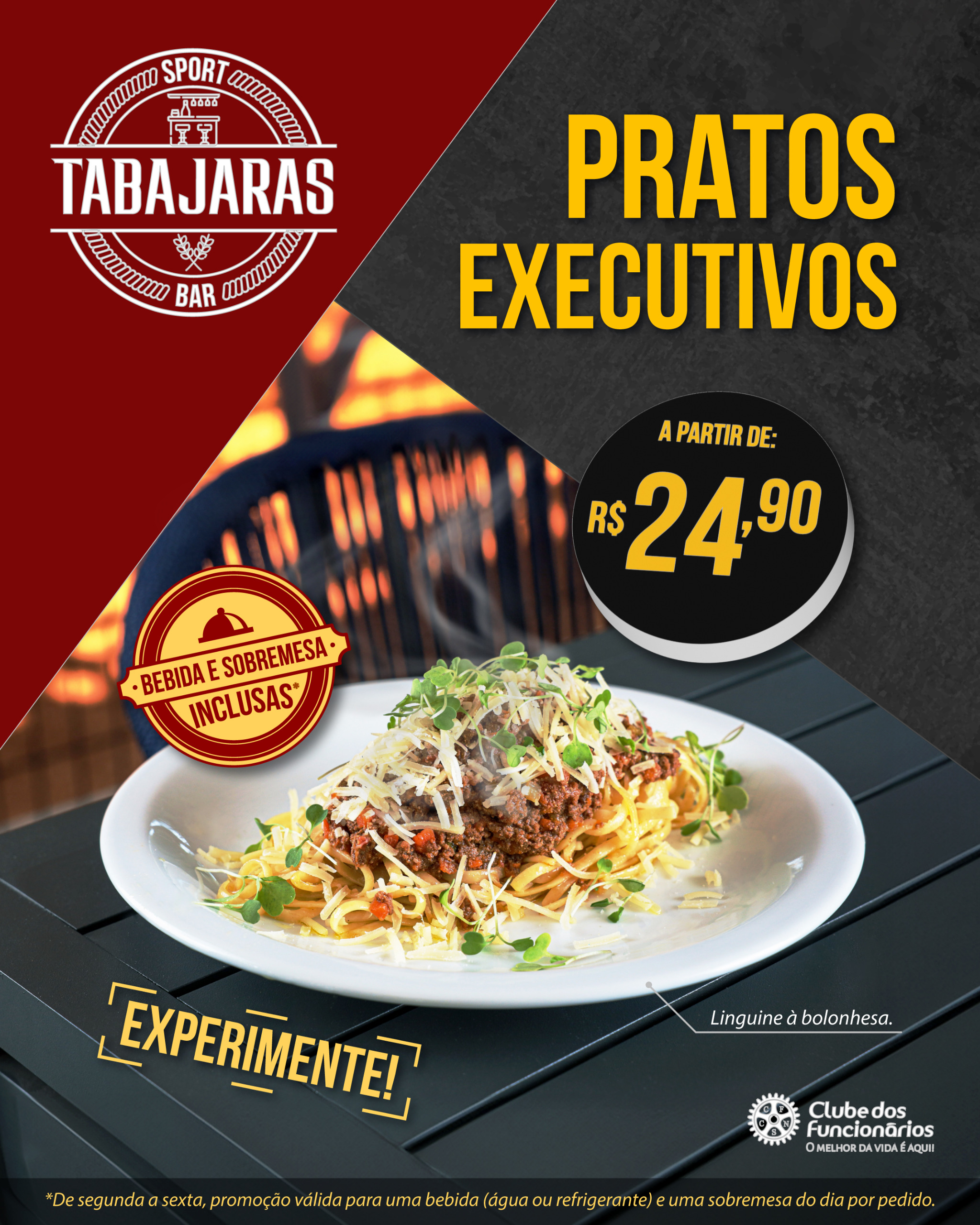 Venha para o Tabajaras Gastrobar e experimente nossos pratos executivos. São várias opções deliciosas que já incluem bebidas e sobremesa para completar a sua refeição!