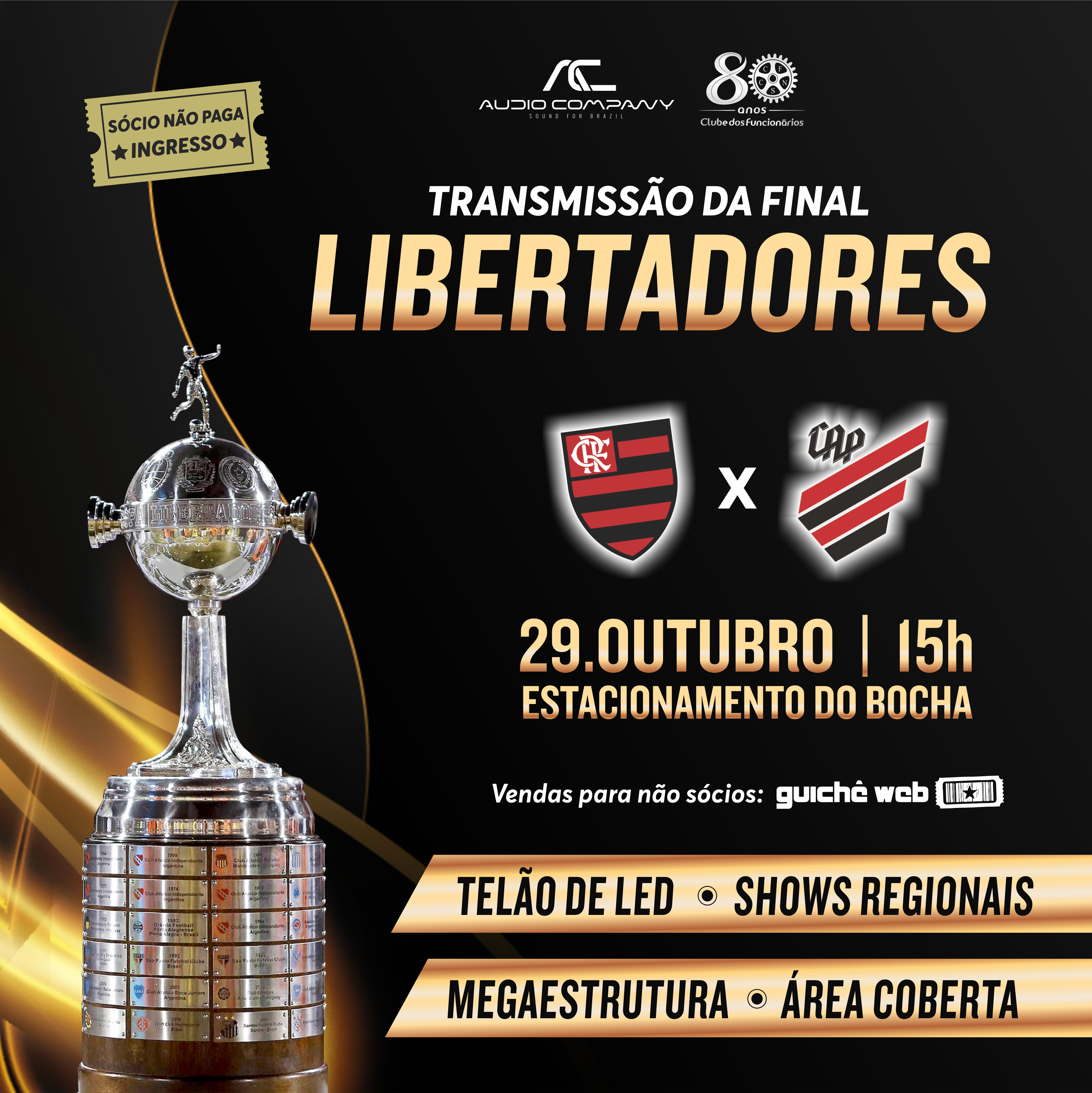 A final da Copa Libertadores, entre Flamengo e Atlético Paranaense, será transmitida no Clube dos Funcionários oferecendo uma experiência singular aos amantes da música e do futebol. O evento acontece no próximo dia 29 de outubro, a partir das 15 horas, em uma área coberta de 1500m² montada na PET (Praça de Esportes Tabajaras) com diversas atrações.